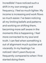 I have noticed such a shift in my own energy and frequency. I feel so much lighter. My income is increasing and work flows so much easier. I've been noticing all my limiting beliefs and patterns and working on shifting them, becoming more self-aware in the moments this is happening. I feel more connected to my Soul and truth. I can feel when something is out of alignment much quicker and viscerally.